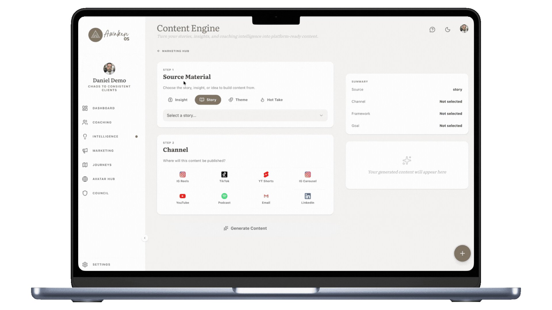 Content ideas surface from your real sessions and stories, structured for the platform you're sharing on. Three focused marketing actions a day replace the infinite overwhelm.